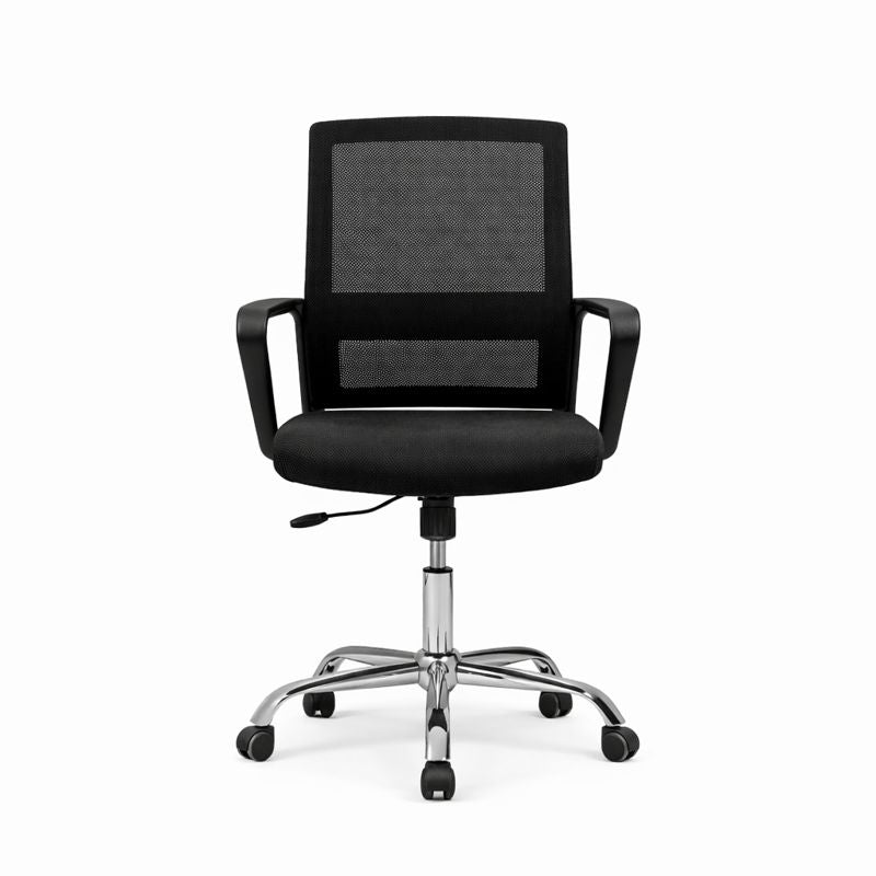 AETHER is a modern ergonomic office chair featuring a breathable mesh backrest, cushioned fabric seat, integrated armrests, smooth height adjustment, 360° swivel function, and a polished chrome base with caster wheels, designed to provide balanced comfort and support in contemporary workspaces.