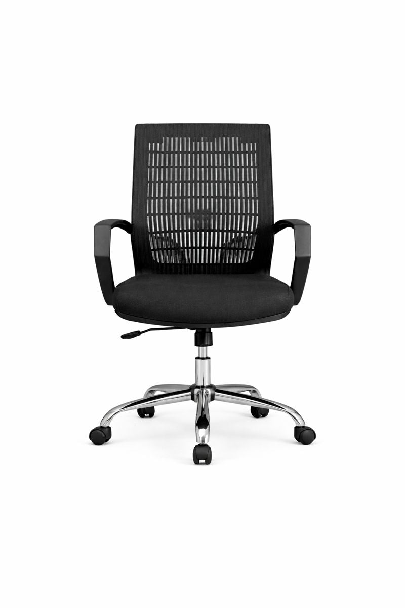 FLOWEN is an ergonomic office chair featuring a breathable mesh backrest, cushioned fabric seat, supportive armrests, smooth height adjustment, 360° swivel function, and a polished chrome base with caster wheels, designed to enhance airflow, comfort, and productivity in modern workspaces.