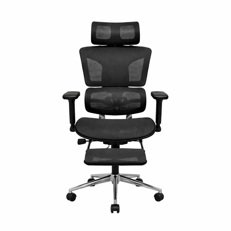 VENTRA is an advanced ergonomic office chair featuring a ventilated mesh back with dynamic spine support, adjustable headrest, height-adjustable armrests, contoured padded seat, smooth tilt and height mechanism, 360° swivel, and a polished metal base with caster wheels for breathable comfort and all-day productivity.